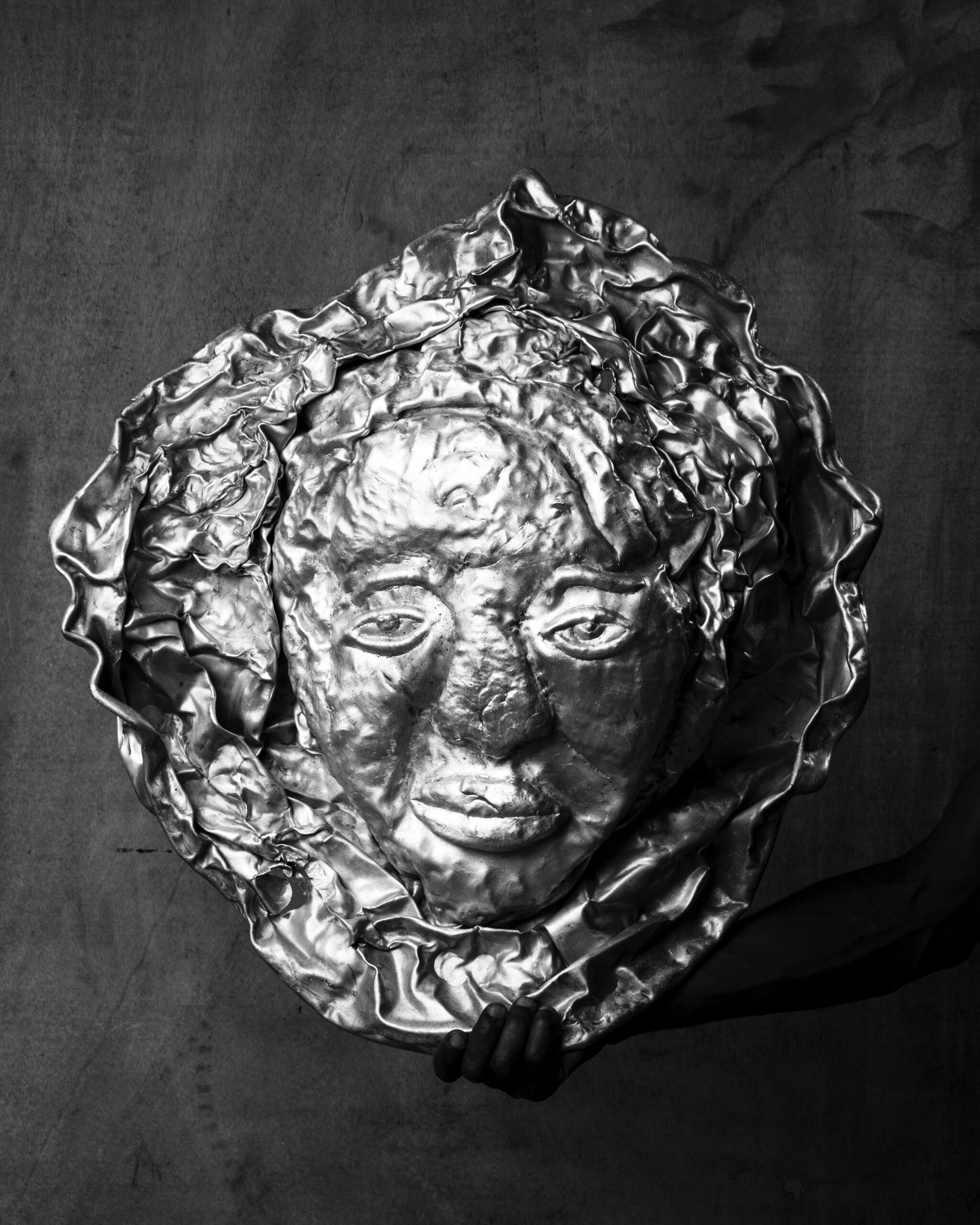 "I exchange the used pans for new ones, then etch their faces into the old and worn an act of acknowledgement and preservation. I shape each surface with hammers and improvised chisels made from scavenged nails. The sound of metal striking metal recalls the rhythm of Sodom and Gomorrah, (an informal settlement in Accra,Ghana) - the clamor of mechanics, carpenters, scrap dealers, vulcanizers - injecting memory and labor into the skin of the sculpture'' - Adjei affirms.