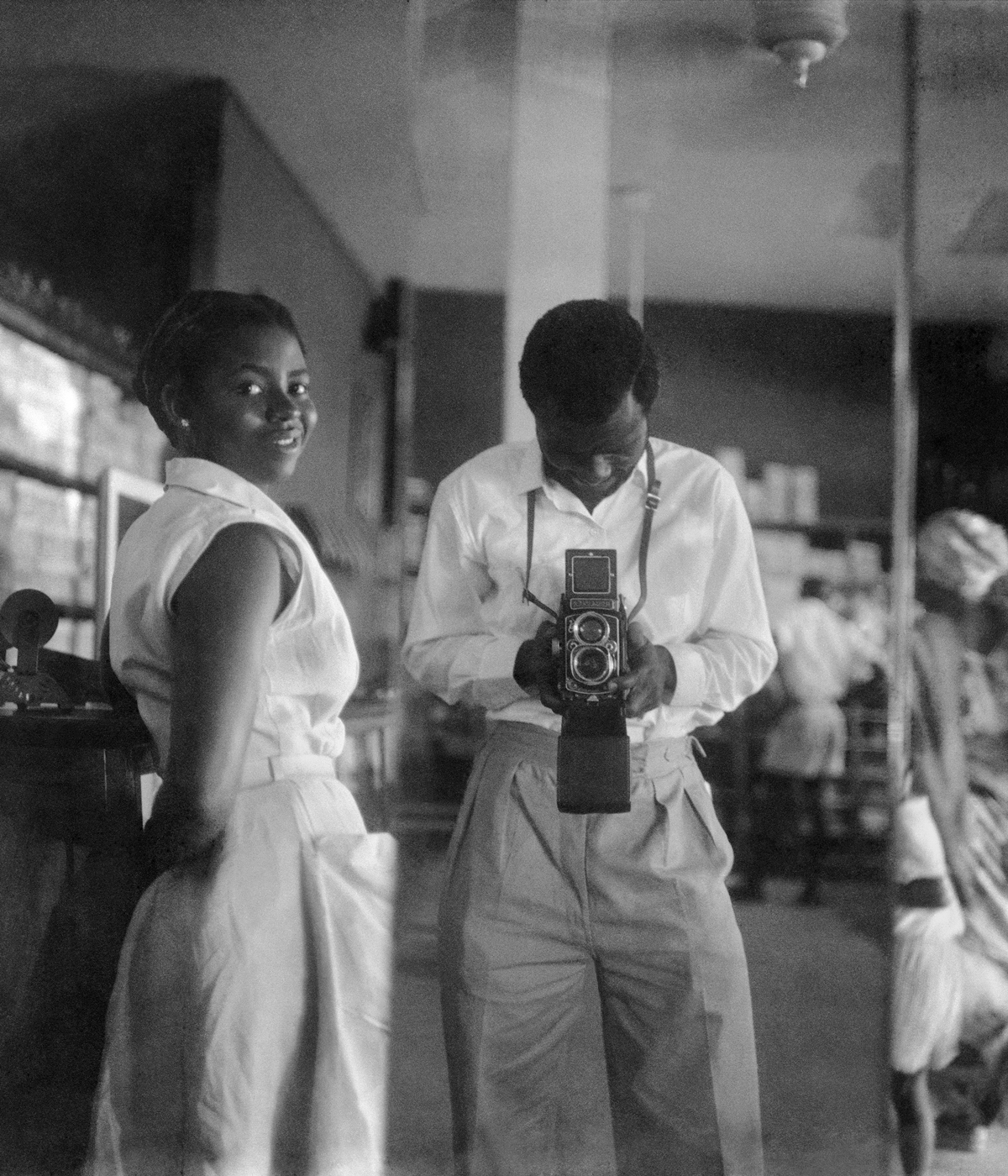 - Self-portrait with a store assistant at the West African Drug Company, central Accra, 1952, James Barnor and galerie Clémentine de la Féronnière