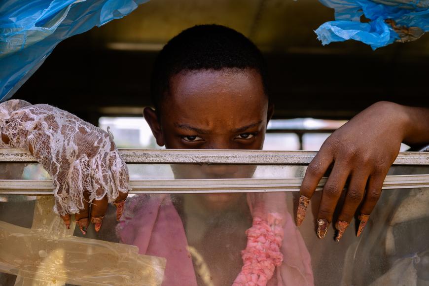 Augure mirrors Baloji’s own journey, exploring the legacies of marginalization, identity, and cultural inheritance. The story opens with Koffi, a man returning to Congo to introduce his pregnant white wife. Expelled as a child because his birthmark was believed to signify zabolo, or the devil, Koffi’s story echoes Baloji’s own reclamation of his surname, which carries the stigma of “sorcerer” in Swahili. Koffi is just one of four central characters: Tshala and Mama Mujila, his sister and mother, navigate the constraints of a patriarchal world, while Paco, a shegue, orchestrates a ritualistic funeral for his deceased sister, enlisting his crew in pink princess dresses. Augure immerses viewers in these lives, dissolving conventional narrative boundaries into a sensory, emotional, and spiritual journey. The film unfolds in a surreal, unnamed space that fuses Kinshasa and Lubumbashi, the D.R. Congo’s cultural and economic hubs. Kinshasa’s dense, Lingala-speaking streets and Lubumbashi’s desolate mining landscapes converge seamlessly, reflecting both colonial and postcolonial legacies. Mining emerges as a dystopian motif: a ceaseless quest for wealth that eludes ordinary Congolese. Koffi’s father, lost to the mines, becomes a spectral presence, emblematic of absent patriarchal authority and systemic erasure.